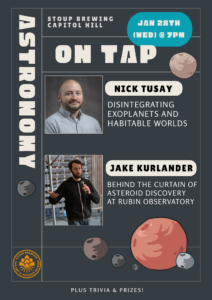 Astronomy on tap is back with some exciting talks this month! Stop by Stoup Brewing Capitol Hill (1158 Broadway) this Wednesday 1/28 at 7pm to hear postdoc Nick Tusay tell us about disintegrating exoplanets and grad student Jake Kurlander gives us a glimpse into how Rubin Observatory discovers asteroids!